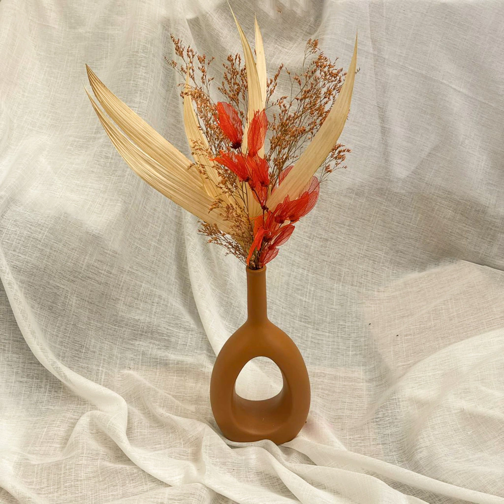Composto por plantas naturais desidratadas em tons de laranja e creme, este arranjo em conjunto é acompanhado por vaso em cerâmica terracota. Perfeito para transformar qualquer ambiente com elegância.