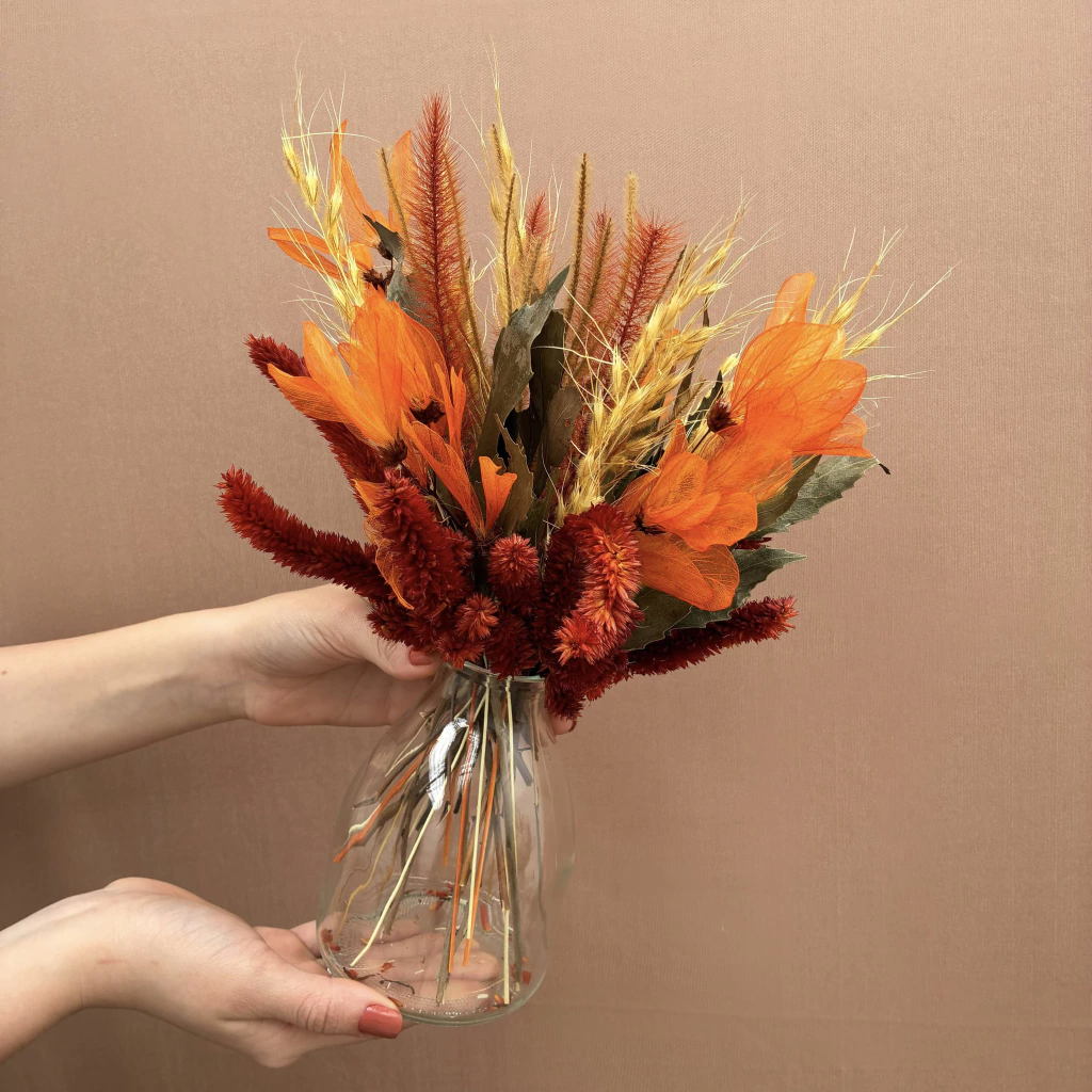 Composto por plantas naturais desidratadas em tons de laranja e verde, este arranjo é acompanhado por vaso de vidro incolor. Perfeito para transformar qualquer ambiente com elegância.