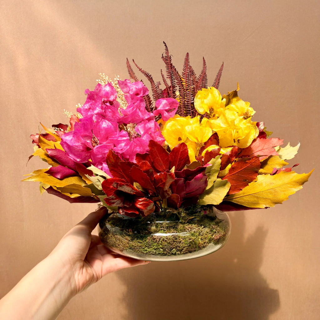 Com um equilíbrio perfeito entre delicadeza e sofisticação, feito a mão com plantas naturais desidratadas este arranjo frente única, combina flores em tons de rosa e pink com folhas em um elegante tom marsala. Acompanhado por vaso de vidro revestido com musgo natural, ele valoriza ainda mais a composição, criando um visual marcante e acolhedor.