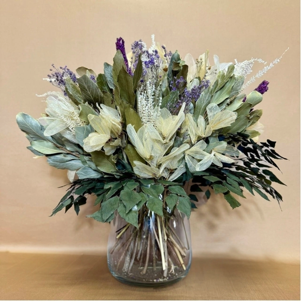 Composto por plantas naturais desidratadas em tons de verde, lilás e branco, este arranjo único é acompanhado por vaso em vidro. Perfeito para um centro de mesa ou aparador, ele transforma o ambiente com elegância.