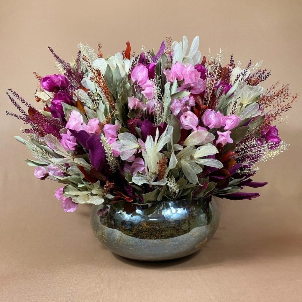 Composto por plantas naturais desidratadas em tons de marsala, verde, terracota e pink, este arranjo único é acompanhado por vaso em vidro âmbar dourado. Perfeito para um centro de mesa, ele transforma o ambiente com elegância.