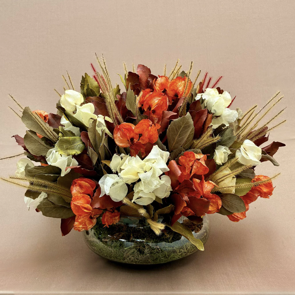 Este arranjo em tons de terracota, laranja e branco é a escolha ideal para quem deseja unir beleza e praticidade.