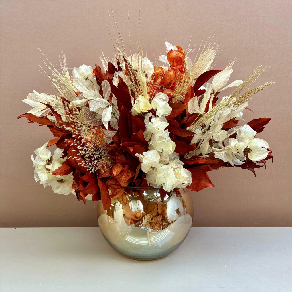Composto por plantas naturais desidratadas em tons de terracota, laranja e branco, este arranjo é acompanhado por vaso Âmbar espelhado. Perfeito para um Centro de mesa ou aparador, ele transforma o ambiente com elegância.