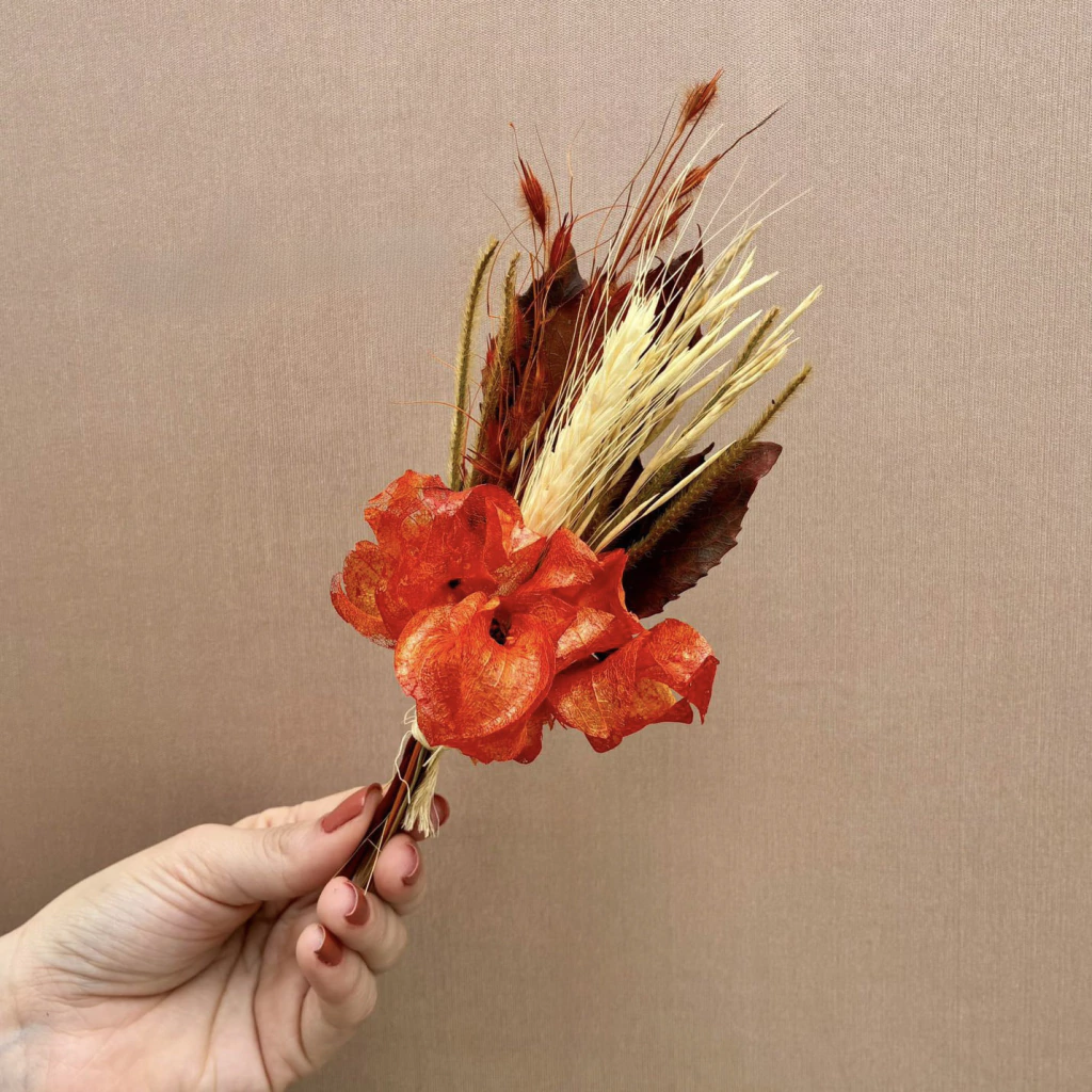 Composto por plantas naturais desidratadas em tons de verde e branco. Nosso mini buquê é perfeito para utilizar em casamentos, eventos e decoração de guardanapos.
